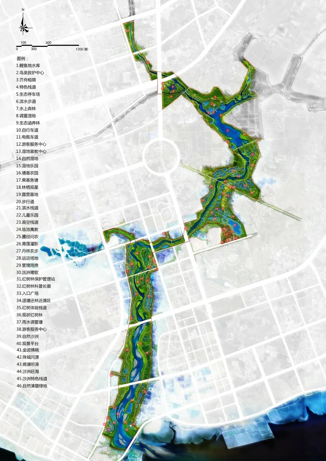 对现状江、渠、塘、湖、海、滩六大要素进行生态修复,恢复生态系统自我调节能力,提升生态系统服务功能,自北向南形成湖库、基塘、红树及沙洲四大生境。